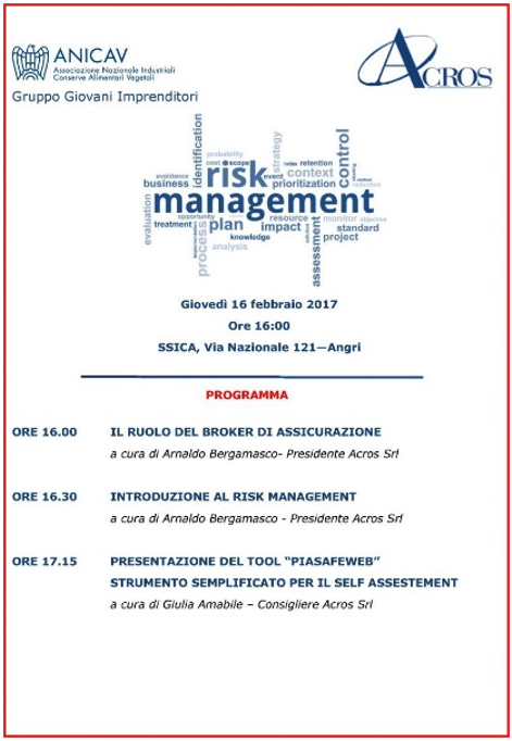 Il Gruppo Giovani Imprenditori ANICAV, giovedì 16 febbraio 2017, alle ore 15:00 presso la SSICA di Angri, organizza un seminario sul Risk Management, in collaborazione con ACROS srl.